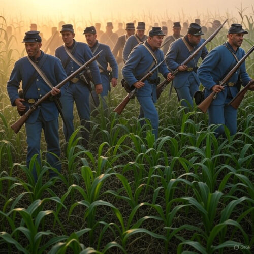 Dawn broke foggy on September 17, around 5:30 a.m., with the crack of rifle fire shattering the quiet. Hooker’s corps, 8,600 strong, advanced through the East Woods toward David Miller’s 40-acre cornfield, a sea of tall stalks hiding Confederate pickets from John Bell Hood’s Texas Brigade. The Cornfield became a charnel house. Union artillery from the Poffenberger Heights raked the field, but as Hooker’s men—Irish immigrants from the 63rd New York and others—pushed forward, they met withering volleys. The corn “ran red with blood,” as one survivor recalled, stalks shredded by Minié balls. By 6 a.m., the 11th Corps under Mansfield joined, but confusion reigned; Mansfield himself was shot by friendly fire while rallying troops, dying hours later.