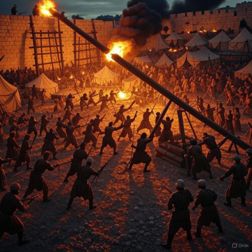 That first night, campfires dotted the hills like fallen stars. Saladin consulted his emirs in a tent aglow with oil lamps. “The Franks hold the city by God’s grace alone,” mused his nephew al-Afdal, “but their hearts are as brittle as their walls.” Saladin, ever cautious, ordered the ring tightened. By dawn of the 21st, sappers—bare-chested Kurds wielding picks and levers—dug at the moat’s edges, while oxen hauled the first mangonel into position. Nicknamed “The Furious,” it loosed its inaugural stone at midday, the boulder arcing like a vengeful comet to smash against the northern wall near the Golden Gate. Shards flew; a defender tumbled, his scream lost in the roar.