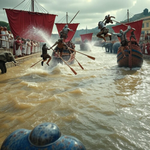 Caesar didn’t stop at parades. The Circus Maximus hosted venationes— beast hunts with 400 lions, 600 Nemean bears (imported at ruinous cost). A naval battle in the flooded circus: 12-foot-deep water, quinqueremes ramming, marines boarding with hooks. “The water ran red,” Dio notes, though mostly stage blood.