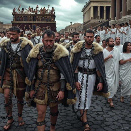 Captives marched in chains— Gallic nobles with shaved heads and torcs, women and children from Alesia’s fall. Vercingetorix himself? He’d languined six years in a Roman dungeon; paraded now, his long hair a defiant mane, eyes burning with the Aedui fire. Behind them, floats— massive wagons like Hollywood sets. One showed the Rhine crossing: Caesar in a toga directing legionaries hammering pontoon bridges while Germans hurled spears from foggy banks. Another: Alesia’s siege, Gauls scaling double walls only to tumble into spike-filled ditches (lilia, Caesar called them— lilies of death).