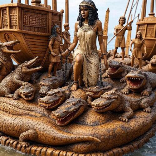 Egypt’s turn was scandalous spice. Inserted oddly between Gaul and Pontus (historians debate why— perhaps to bury civil war vibes), it paraded Nile spoils: obelisks (one still stands in Vatican Square), Ptolemaic gems, even hippos and crocs in cages (the crocs ate a spectator, says Cassius Dio). Arsinoe IV, Cleopatra’s sister-rival, chained and tear-streaked, led the captives— her Ptolemaic diadem a crown of thorns. Whispers rippled: Was that Cleopatra’s influence, parading her foe? The float? Actium’s precursor— Caesar’s legions storming Alexandria, Pothinus’ eunuch head on a pike (the real one, pickled).