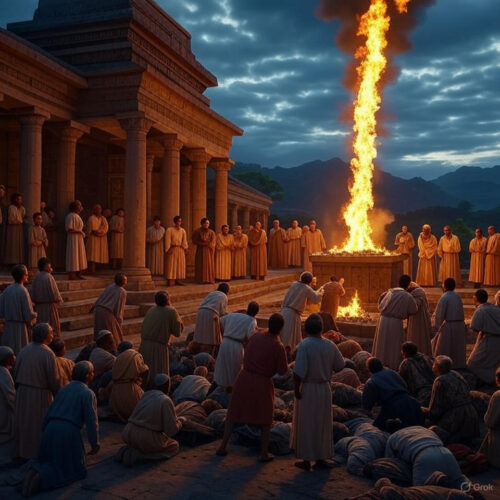 And then—the money shot. Solomon rises, blesses the crowd anew, and commands sacrifices. Altars overflow; blood soaks the pavement in ritual excess. The king turns, and in that moment, fire tumbles from heaven (2 Chronicles 7:1-3). Not a spark, but a roaring blaze, consuming offerings in a whoosh of holy pyrotechnics. The glory cloud returns, thicker now, and the people? They hit the deck, faces to the ground, chanting, “He is good; his love endures forever.” For seven days, the party rages—sacrifices, feasting, Torah readings under starry skies. Solomon sends them home on the eighth day, hearts ablaze.