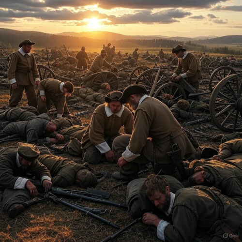 The battle’s hinge moment arrived mid-day. With Banér’s line buckling—Scottish regiments under Leslie mauled in relief efforts, their formations shredded by grapeshot and close-quarters pike duels—King’s cavalry finally emerged from the woods. This unexpected thunder on the Imperial flank sowed panic; Hatzfeld’s reserves, including Major-General Vitzthum’s hesitant cavalry, failed to counter effectively. Leslie’s son-in-law, Major-General John Ruthven, led a decisive charge that captured Imperial artillery, turning the guns against their former owners. The Swedes’ superior firepower and coordinated infantry-cavalry assaults overwhelmed the defenders. As dusk fell, the Imperial-Saxons routed in disorder, abandoning positions and fleeing toward the Elbe, their cohesion shattered by the double envelopment. Casualties underscored the pyrrhic nature: Swedes lost 3,500 (dead and wounded), a grim toll reflecting the frontal sacrifices, while Imperials suffered 5,000 killed, wounded, or captured, plus all their artillery.