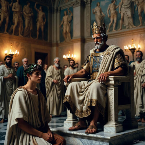 The rift with Constantius widened like a fault in the Alps. In 360 AD, as Persian threats loomed, the emperor demanded Julian’s best Illyrian troops for the Eastern front. In Paris, the legions—fiercely loyal after years of victories—revolted at the order, proclaiming Julian Augustus on the spot. Bonfires blazed along the Seine, garlands of oak leaves crowned his brow, and the cry “Augustus! Augustus!” drowned the winter winds. Julian, torn between duty and the mob’s roar, accepted with feigned reluctance, minting coins that boldly omitted Constantius’s name. Civil war brewed: envoys crossed the empire like poisoned arrows, while soothsayers read entrails for omens.