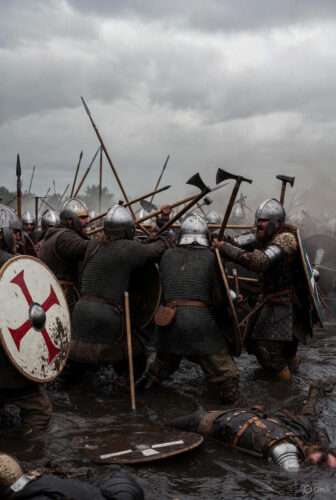 Penda’s army, confident in numbers, advanced, but internal fractures emerged. Oswiu’s nephew Æthelwald, king of Deira, initially guided the Mercians but withdrew, awaiting the outcome from safety. Cadafael of Gwynedd, later dubbed “battle-shirker,” deserted with his troops under cover of night. These betrayals weakened Penda’s flanks.