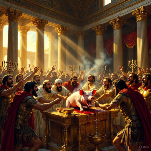 But the worst came in 167 BC. Antiochus outlawed Jewish practices: no more Sabbath observance, no circumcision, no kosher laws. He mandated sacrifices to Greek gods, turning the Second Temple into a shrine for Zeus Olympios. Pigs—unclean animals—were slaughtered on the altar, a deliberate desecration. Inspectors roamed villages, forcing Jews to eat pork or face execution. Many complied out of fear, but others fled to the hills or secretly practiced their faith. This “abomination of desolation,” as described in the Book of Daniel (likely written during the revolt), ignited widespread outrage.