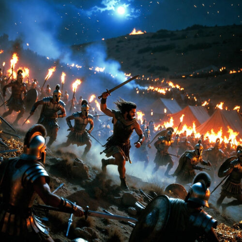 Judas’s strategy was brilliant: divide forces into small units for mobility, use scouts for intelligence, and pray for divine aid before attacks. The rebels armed themselves with captured weapons—swords, spears, and bows—since they lacked heavy armor or cavalry. In 165 BC, Lysias sent Gorgias with 5,000 infantry and 1,000 cavalry to Gophna. Gorgias planned a night raid on Judas’s camp at Emmaus, but Judas, tipped off by scouts, evacuated and counter-attacked the unguarded Seleucid camp, burning it and routing the troops. When Gorgias returned, he found his base in flames and fled.