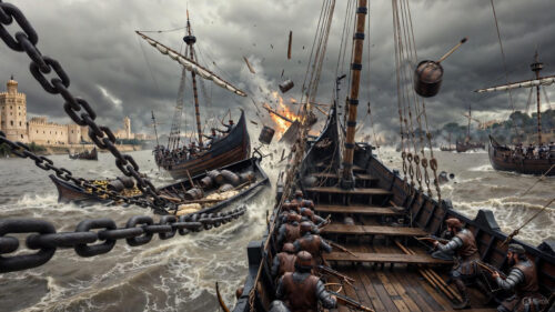 In a feat of audacious engineering, Bonifaz fortified two naos with oak bulwarks and rams, then charged at flood tide. Oars churned froth as the lead ship, *Santa María*, struck the chain. Links groaned, snapping with a thunderclap that chronicles liken to “the devil’s harpstring breaking.” The bridge crumpled, barges capsizing in whirlpools, dooming Triana to isolation. Almohad archers from the Torre del Oro loosed volleys—killing dozens—but Bonifaz’s galleys replied with catapulted pitch barrels, igniting riverside wharves. By dusk, the river ran red with blood and flotsam; Seville’s supply line severed, famine’s specter loomed.