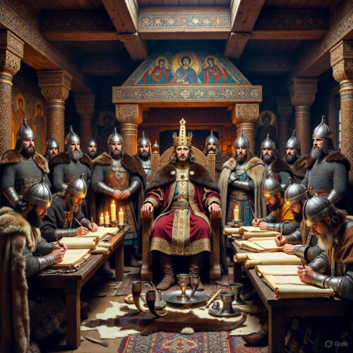 Vladimir’s son, Yaroslav the Wise (r. 1019–1054), elevated Kyiv to near-mythic splendor. A builder par excellence, he erected the Saint Sophia Cathedral, its mosaics shimmering with tales of Christ and the apostles, crafted by Byzantine artisans who marveled at the Slavs’ eagerness to learn. Yaroslav’s library rivaled Europe’s finest, housing tomes on law, medicine, and theology. His *Rus’ka Pravda* – the first Slavic legal code – balanced blood feuds with fines, protecting widows and orphans while curbing noble excesses. Diplomatically, he married his daughters to kings of France, Norway, and Hungary, weaving Rus’ into Europe’s royal web. “Kyiv is the head of Rus’,” proclaimed the chroniclers, and indeed it was: a city of stone palaces amid wooden hovels, where boyars (nobles) feasted on roasted swan and mead, while peasants tilled black-earth fields bursting with rye and barley.