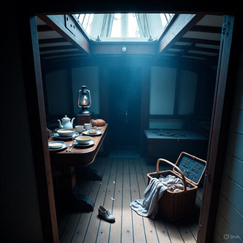 The *Mary Celeste* wallowed beam-to, sails luffing lazily, as if napping on the swells. No tattered rigging, no splintered masts—just an eerie tidiness. Hatches uncovered but decks dry; the galley stove cold, breakfast dishes stacked neatly—oatmeal bowls licked clean, a child’s tin cup upright. In the captain’s cabin, Sarah’s sewing basket open, a half-stitched frock for Sophia draped over a chair; Briggs’s pipe, tobacco pouch intact, beside his Bible at Psalms 50: “He that offereth the sacrifice of thanksgiving… shall glorify me.” The slate log, last entry November 25, smeared but legible. Belowdecks, nine barrels stove in, alcohol puddled but not aflame; the yawl missing from its davits, sea-lashed lines trailing like umbilical cords.