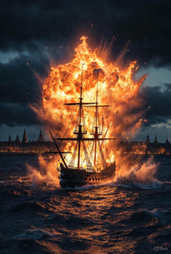 The blast vaporized the ship instantly. A column of fire 3,000 feet high lit the sky. The shockwave hurled 30-ton cannons half a mile inland; one landed in the king’s deer park. The seabed was scoured to bare rock in a 400-yard crater still visible today. Every window in Copenhagen facing the harbor exploded inward. People 15 miles away were knocked flat. A rain of iron, wood splinters, and human remains fell for six full minutes.