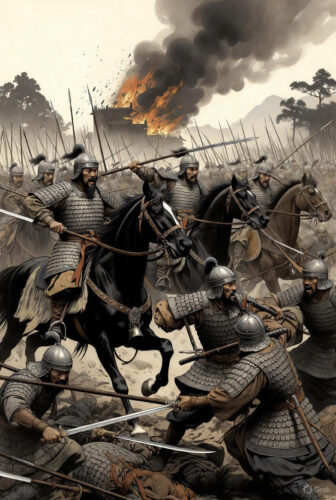 The Tang counteroffensive gathered steam. Xizong, from exile, rallied warlords like Li Keyong, a Shatuo Turk chieftain, and Wang Chongrong. In 882, alliances formed, and by spring 883, Li Keyong's forces, bolstered by Uyghur cavalry, besieged Chang'an. Huang's army, weakened by desertions and infighting, crumbled. A massive battle saw 150,000 Qi troops decimated; Huang fled east, abandoning the capital to looting Tang soldiers. Chang'an, once a jewel, was reduced to rubble—palaces burned, markets emptied.