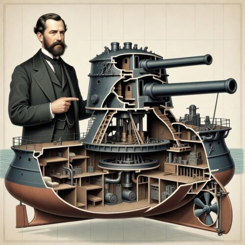 John Ericsson, the brilliant Swedish-American inventor born in 1803 in Värmland, Sweden, had immigrated to the United States after successes in England (including early work on the screw propeller and hot-air engines). Ericsson was eccentric, driven, and prolific—holding patents for steam engines, propellers, and more. In late 1861, he submitted a bold design to the Navy's Ironclad Board after President Lincoln personally urged rapid innovation. Ericsson's plan: a shallow-draft vessel with thick iron plating, a minimal freeboard (only 18 inches above water), and most revolutionary—a revolving cylindrical turret housing two 11-inch Dahlgren smoothbore guns. The turret rotated via steam power, allowing 360-degree fire without maneuvering the entire ship.