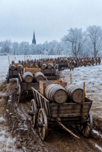 Herring had been a dietary and economic powerhouse for centuries. Caught in massive shoals in the North Sea and Baltic, salted or smoked herring traveled well, provided essential nutrition, and formed the basis of a vast trade network dominated by the Hanseatic League cities. For an army in the field during Lent, barrels of salted herring were literal lifesavers—cheap, durable, and spiritually compliant. Chronicles note that the English relief convoy included not only crossbow bolts, cannonballs, powder, and other munitions but also a significant cargo of these fish barrels, alongside other Lenten staples. One estimate places the convoy at around 300 wagons and carts, a substantial rolling warehouse guarded by several hundred to a few thousand troops.