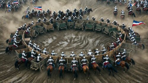 On the morning of February 12, the two forces clashed near the small town of Rouvray (or Rouvray-Saint-Denis). The English, forewarned or reacting swiftly to the approaching threat, did not panic. Fastolf issued crisp orders: the wagons were drawn into a defensive formation—a circular or oval laager, with vehicles interlocked or chained to create a makeshift wooden wall. This tactic, reminiscent of wagon forts used by various armies (including the Hussites in Bohemia around the same era), turned the convoy into an improvised fortress. Gaps between wagons were filled with archers and spearmen. Horses were secured inside or behind, and the precious barrels—herrings included—served as additional cover or ballast.