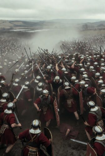 Dawn broke cold and foggy—perfect for ambushes and dramatic entrances. The armies lined up in classic Roman fashion: Infantry in the center, cavalry on the flanks, auxiliaries peppering the lines. Severus's forces included Pannonian and Moesian legions—veterans of Parthian wars—while Albinus had the disciplined Brits, known for their heavy infantry and Celtic flair. The battle raged for two days, which was unheard of; most Roman fights wrapped up by lunch. Wave after wave crashed: Spears flew, shields bashed, swords sliced. Imagine the noise—a cacophony of war cries, trumpet blasts, and the thud of catapults launching rocks. At one point, Albinus's left flank buckled, but his center held like a stubborn mule. Severus, sensing weakness, committed his cavalry—Praetorian horsemen and Moorish light cavalry—in a flanking maneuver. It was a game-changer; the horses thundered in, trampling Albinus's exposed side.