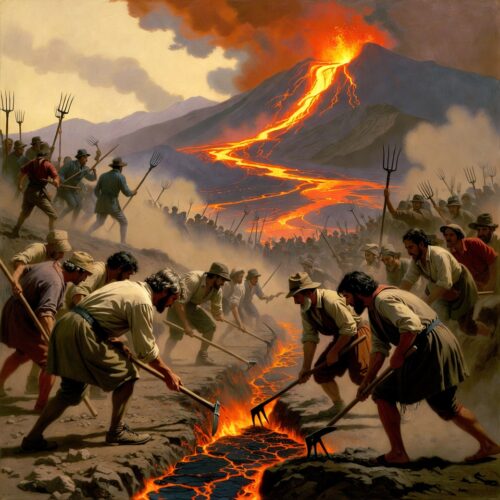 Here’s where the story turns gloriously human and hilariously defiant. In mid-April, with lava threatening Catania, a group of engineers and citizens from the city decided on radical action: divert the flow. They marched uphill to a spot above Paternò (a town in the lava’s path) and started digging a trench to channel the molten river away from Catania and toward… well, Paternò. Brilliant in theory. Catastrophic in practice. The Paternò locals—watching their own doom approach—attacked the diggers with stones, pitchforks, and fury. “Why should we burn so you don’t?” they yelled. The diversion failed. The workers retreated. The lava kept coming. But the attempt itself was historic: the first documented effort anywhere to redirect a lava flow. These 17th-century Sicilians invented volcanic crisis management on the fly.