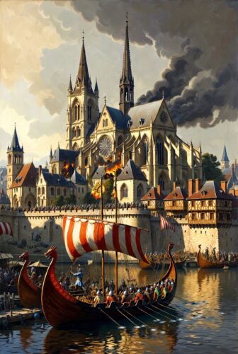 The Vikings, unified and mobile, exploited the mistake with ruthless efficiency. They slammed into one of the Frankish divisions, routed it in a sharp engagement, and took 111 prisoners. To maximize terror and honor their gods, they hauled the captives to an island in the Seine and hanged them in a grim display dedicated to Odin—the Allfather who himself hung from the world tree for wisdom. The psychological blow landed. The surviving Franks on the other bank watched in horror, morale shattered. No heroic stand, no unified front—just panic and retreat. The Viking fleet pressed on, oars dipping in perfect rhythm, shields gleaming along the gunwales. They arrived at the outskirts of Paris right around March 28-29, with Easter Sunday (March 29) marking their triumphant entry. The city wasn't a sprawling metropolis yet; its heart was the island citadel, protected by old Roman walls but lightly garrisoned against this scale of threat. Inhabitants had fled or barricaded themselves, leaving churches, monasteries, and markets ripe for plunder. The Vikings poured in, looting silver chalices, gold reliquaries, fine linens, spices, and whatever else glittered. Paris fell without a prolonged siege—more a swift occupation than a drawn-out battle.