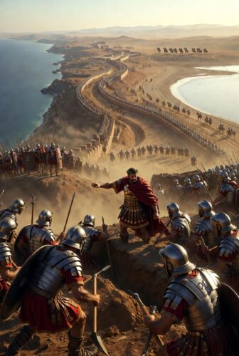 Caesar landed in late 47 BC with a dangerously small force—perhaps five understrength legions at first, plus auxiliaries. Winter storms scattered his ships. Supplies were scarce. The Pompeians under Labienus and Petreius nearly trapped him at the Battle of Ruspina in early 46 BC. Caesar’s men formed a desperate circle; Labienus taunted them with captured standards. Yet Caesar’s veterans held, and he slipped away to reinforce. Over the next months, he conducted a masterclass in Fabian delaying mixed with aggressive foraging. He seized grain islands, built fortifications, drilled recruits, and waited for the rest of his army—eventually swelling to 10-12 legions (including the famous Legio V Alaudae, the “Larks,” raised from Gallic recruits and now battle-tested). Skirmishes at Uzitta and elsewhere wore down the enemy. Scipio tried to bait Caesar into premature battle by parading daily outside his camp. Caesar refused. He knew time favored the side with discipline and logistics. By early April, Caesar had maneuvered to besiege Thapsus itself—a strategic coastal town with a narrow land corridor ideal for forcing the enemy into a bottleneck. He threw up double circumvallation lines—ditches, ramparts, artillery—sealing the town from land and sea. Scipio had no choice but to march to relieve it.