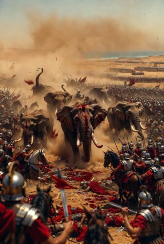 Dawn on April 6 broke with both armies arrayed on that fatal peninsula. Caesar’s forces: veteran legions in the classic triplex acies—three lines—with Legio X Equestris and VII on the right, VIII and IX on the left, newer units in the center. Flanks protected by archers, slingers, and cavalry. Crucially, he split Legio V Alaudae into cohorts ready to counter elephants. Scipio mirrored with his own legions backed by Juba’s Numidians and—most terrifyingly—those 60 elephants on the wings, each beast carrying a howdah with javelin throwers. The terrain funneled everything into a killing ground. Standoff. Then Caesar’s trumpets sounded the general advance—against his own orders in some accounts, perhaps while he suffered one of his epileptic seizures (Plutarch hints at it). The legions surged forward, shouting their battle cries.