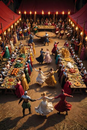 Imagine the scene on that crisp April morning. Edward, in his prime, strides into the lists flanked by his closest knights. The crowd roars as heralds proclaim the rules: honor above all, no grudges carried beyond the field, loyalty to the crown. Joust after joust unfolds—lances splintering against shields painted with dragons, lions, and griffins. One knight, perhaps playing Lancelot, unhorses his opponent in a cloud of dust; the fallen man rises laughing, bruised but alive, and they clasp arms in Arthurian brotherhood. Feasts stretch long into the evening: whole oxen roasted, pies shaped like castles, subtleties (edible sculptures) depicting the Grail. Dancing begins as the sun sets, ladies in flowing gowns pairing with armored knights who’ve swapped steel for silk. Edward himself likely participated or at least judged, reinforcing his image as the new Arthur—wise, just, invincible.