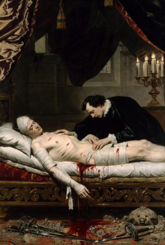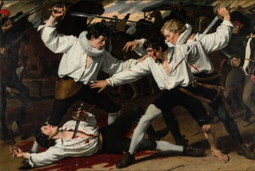 Dawn on April 27 broke cool and gray. The six men arrived on foot or horseback, stripped to their shirts for mobility, rapiers glinting. No seconds stood aside as referees; in true Renaissance fashion, everyone piled in. What followed was less a gentlemanly exchange of honor and more a frenzied brawl. Swords clashed in a whirlwind. Maugiron and Schomberg went down almost instantly, throats and chests pierced. Ribérac took mortal wounds and lingered until the next noon. Caylus himself was stabbed nineteen times—arms, legs, torso—yet somehow fought on until he collapsed in a heap of blood-soaked silk. Livarot took a savage cut across the face that left him scarred and hospitalized for six weeks. Dunes escaped with nothing but a scratch on his arm. The ground turned muddy red. Passersby and stable hands watched in horror as the king’s favorites butchered each other over a tennis grudge.